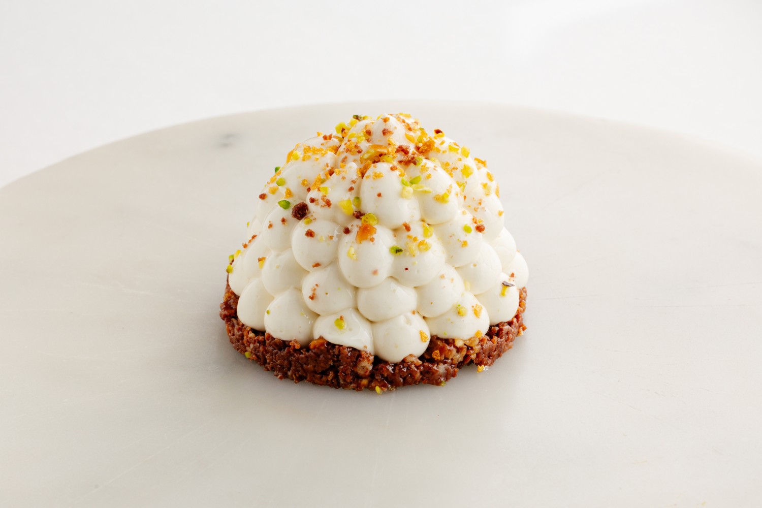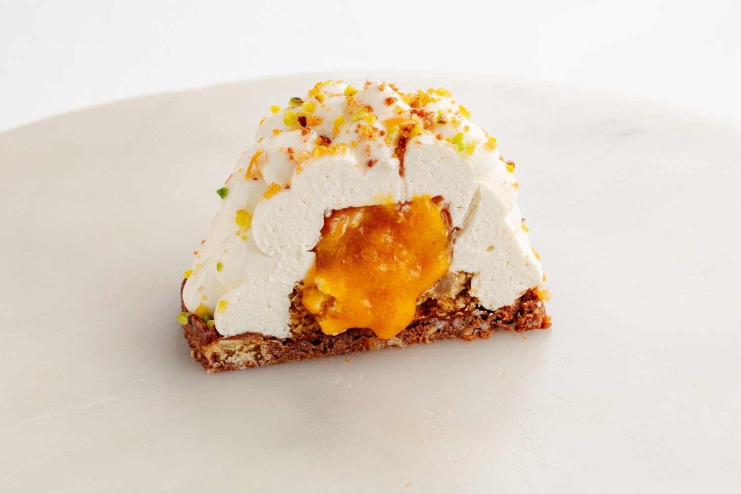 Взбитый кофейный ганаш с начинкой из хурмы и абрикоса на банановом бисквите и крамбле из молочного шоколада, посыпанный фисташково-шоколадной крошкой